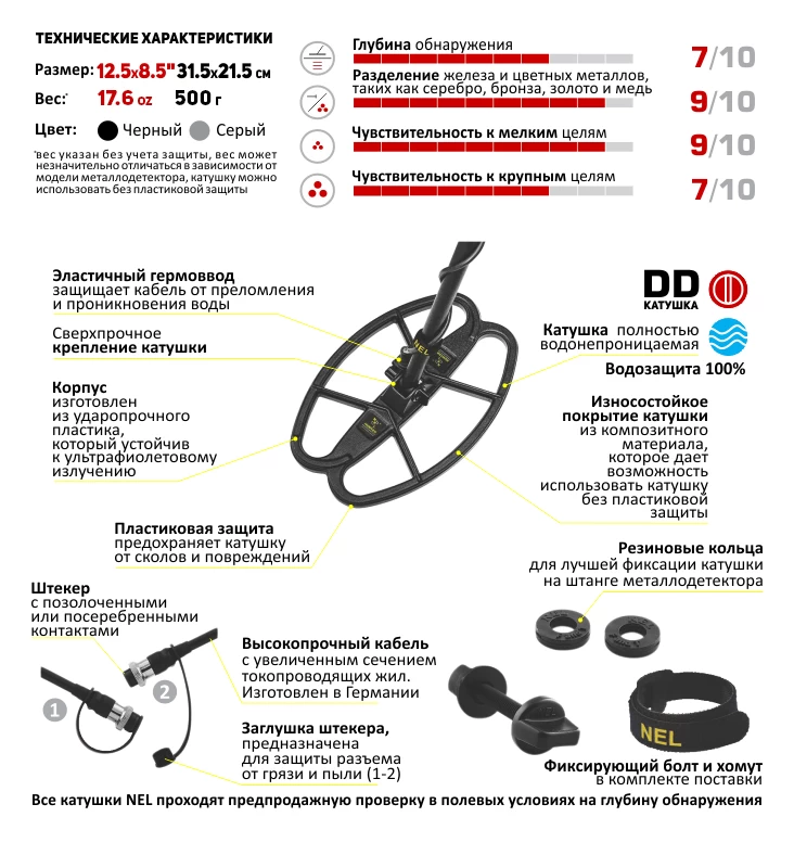 Эксклюзивный продукт от NEL - двухчастотня катушка. Катушка Hunter создана для поиска на участкам земли, сильно замусоренным железом, теперь с возможностью переключения частот. Катушка необычайно легкая для своего размера, всего 500 грамм, что дает возможность легко вести поиск целый день! Выбор частоты позволяет оптимально настроить металлодетектор для различных условий поиска. Катушка имеет прекрасную маневренность и чувствительность к крупным, средним и особенно мелким целям на замусоренных железом участках земли, таких как недавно исчезнувшие поселения людей, пляжи, парки. Эта катушка превосходит стандартные катушки по глубине 10% и по площади сканирования грунта от 20%. Рекомендуется как замена штатной катушки. Катушка полностью водозащитная, корпус залит эпоксидной смолой и дополнительно имеет черное защитное покрытие, которое используется для защиты морских яхт и катеров, что дает возможность вести поиск этой катушкой без использования пластиковой защиты. Катушка отлично справляется с высокой и средней минерализацией грунта. Рекомендуется профессионалам и любителям!