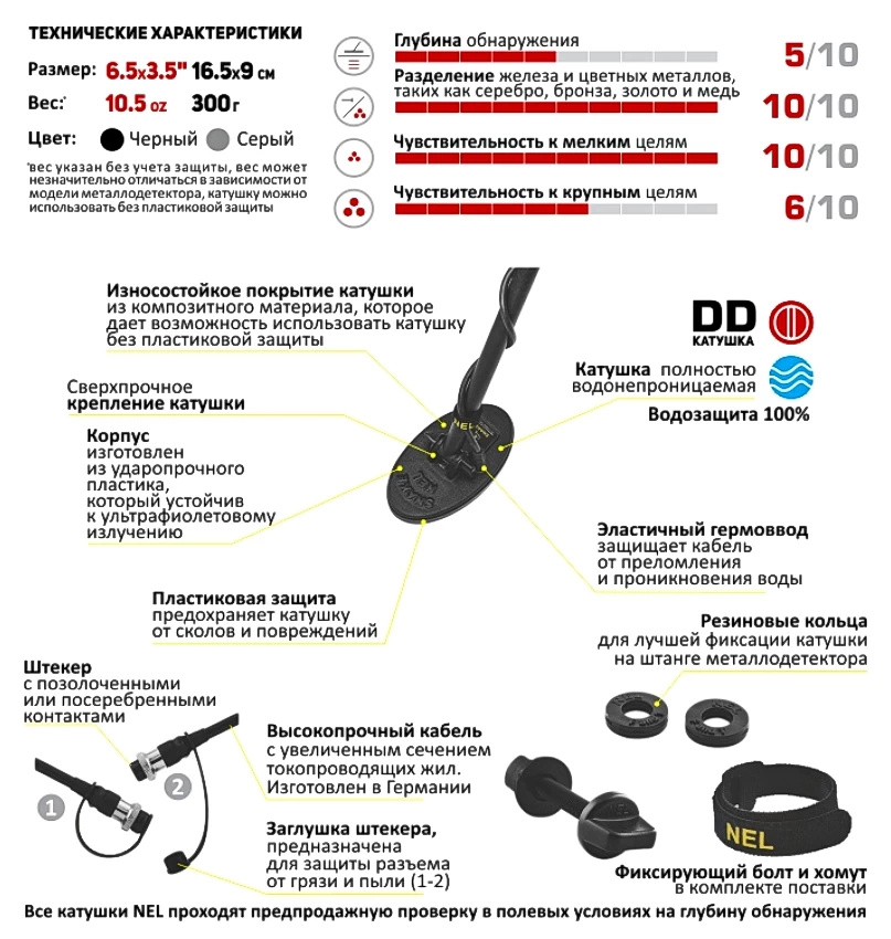 Катушка Snake создана для поиска на участках земли, сильно замусоренных железом, и другим мусором. NEL Snake является лучшей катушкой для поиска на пляжах, эта катушка сочетает в себе хорошую избирательность и площадь захвата. Форма катушки способствует отличному разделению цветных и железных целей. Катушка имеет малый вес и прекрасную маневренность, рекомендуется для использования на пляжах, фундаментах разрушенных строений, поселений захламленных мусором. Катушка обладает хорошей чувствительность к крупным, средним и особенно мелким целям. Рекомендуется как дополнительная катушка. Под заказ фирма NEL может делать эту катушку с кабелем длинной до 3 метров. Катушка полностью водозащитная, корпус залит эпоксидной смолой и дополнительно имеет черное защитное покрытие, которое используется для защиты морских яхт и катеров, что дает возможность вести поиск этой катушкой без использования пластиковой защиты. Катушка отлично справляется с высокой и средней минерализацией грунта. Рекомендуется профессионалам и любителям!