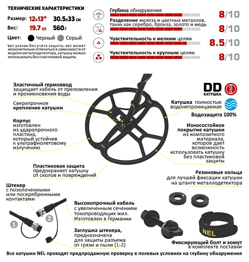 Катушка Tornado это самая знаменитая катушка компании NEL. Это «золотая середина» для поиска монет, кладов и артефактов на местах военных сражений на любой территории. Катушка необычайно легкая для своего размера, всего 560 грамм, что дает возможность легко вести поиск целый день! При медленной поводке, катушка отлично обнаруживает не только большие и средние цели, но и маленькие цели весом менее 1 грамма на глубине не достижимой для любой стандартной катушки. Эта катушка превосходит стандартные катушки по глубине от 20% и по площади сканирования грунта от 25%. Рекомендуется как замена штатной катушки. Катушка полностью водозащитная, корпус залит эпоксидной смолой и дополнительно имеет черное защитное покрытие, которое используется для защиты морских яхт и катеров, что дает возможность вести поиск этой катушкой без использования пластиковой защиты. Катушка рекомендуется для использования на открытых площадях. Катушка отлично справляется с высокой и средней минерализацией грунта. Рекомендуется профессионалам и любителям!